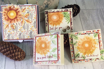 And the second one is the Painted Autumn. This is in the new seasonal catalogue. Its a bit different to the daisy set in that the background colour is cream rather than white. This really appeals to me. This is a picture from the catalogue with items using the painted harvest set. Followed by three little cards I made as samples.